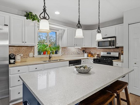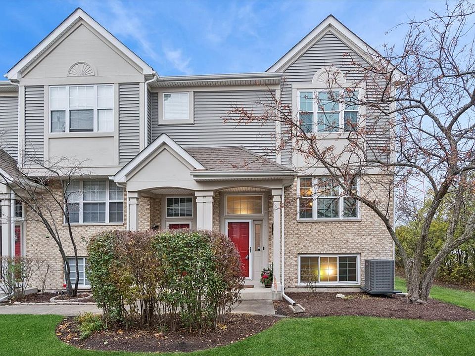 Welcome home to this fantastic end-unit condo in the desirable Woodmere community! This beautifully maintained home features a bright, spacious eat-in kitchen with white cabinetry, a large island, quartz countertops, and stainless-steel appliances, along with access to a large balcony. Brand-new luxury vinyl flooring (2025) extends throughout both the first and second floors, giving the home a fresh, modern feel. Upstairs, you'll find a generous primary suite with double closets and a private bath complete with a relaxing soaking tub. A second bedroom, another full bath with custom walk-in shower, generous loft area, and a convenient laundry space with a 2022 washer/dryer complete the upper level. The finished lower-level office/den provides fantastic extra space for work or play. Numerous major updates include new triple pane windows and patio door (2021), furnace (2022), A/C (2018), roof (2017), and garage door opener and springs (2022), giving you peace of mind for years to come. Great location within Center Cass District 66 and close to shopping, dining, and parks. Welcome home!
