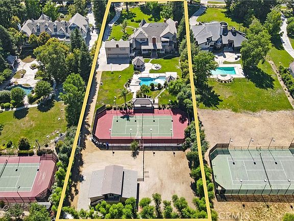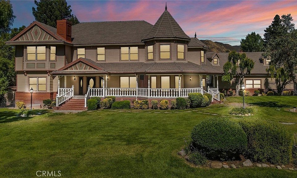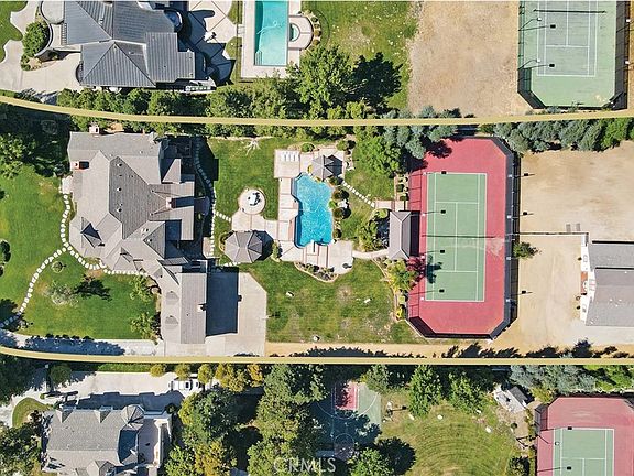 Stately 2 story ranch home with 7 bedrooms, 9 bathrooms plus an additional 420sqft detached guest house! The majesty of this unique home will captivate you the moment you enter the threshold of this estate and behold this picturesque property from a distant perspective. This is a 2-acre haven in the middle of which is a 2 story home replete with charming features – porches and balconies, roof turret, abundant windows and other exquisite details. Impeccable attention to detail is evident throughout. The home celebrates warm natural wood accents in the doors, floors, window casements, paneling, fireplaces, crown molding and built-ins creating an atmosphere of rustic refinement. The heart of this home is the spacious eat-in kitchen complete with a grand island, 5 burner gas stove, and generously-sized pantry, as well as a separate formal dining space with stunning coffered wood ceiling. Exuding timeless character, there’s an incredible classic sit-down wet bar with sink and ice maker. Elevating the indoor ambiance, soaring ceilings and oversized windows flood the interiors with an abundance of natural light, infusing the living spaces with a radiant warmth. Welcoming you through double doors, the primary suite features a fireplace, built-in window seat, 2 walk-in closets and an ensuite refuge with spa tub, double sinks, separate shower, bidet and a versatile adjoining room suitable for an exercise/weight/yoga room (or whatever your heart desires). There’s an additional upstairs guest space with a family room, bedroom and bathroom and accessible by an outside staircase. You’ll also find a lovely dedicated office space with built-ins galore in a unique wood paneled turreted ceiling. Outdoors you’ll find a magnificent backyard entertainer’s paradise with a covered kitchen/bar, a gazebo-covered spa, tennis courts with large covered area adjacent, lovely pool, barn with 2 horse stables, arena, and fully equipped guest cottage with grassy and treed landscaped expanses, front and back. While this compound exudes a sense of seclusion and tranquility reminiscent of a distant retreat, it remains conveniently connected. Despite feeling worlds awau from the city, it's under 20-minutes to the I5 freeway and just 10 minutes to Hwy. 14, seamlessly combining the best of both worlds.