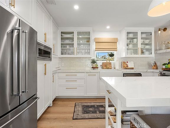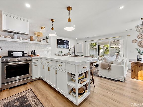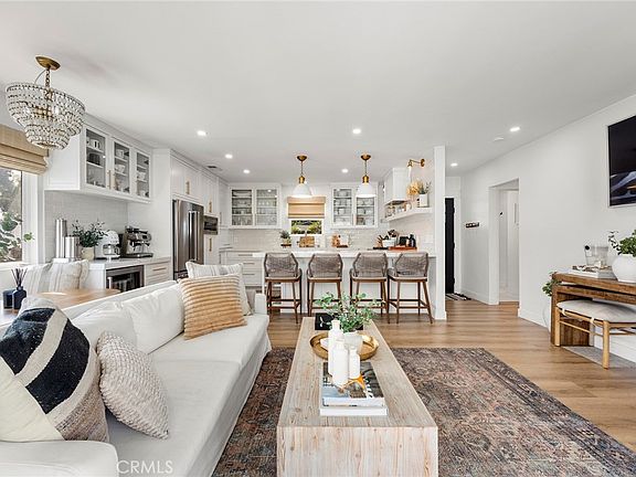 Single story, mid-century modern, three bedroom, two bathroom home completely and thoughtfully remodeled and tucked into a charming, close knit neighborhood. When it comes to renovation, the sellers have thought of everything! Step into this lovely home and marvel at the gorgeous, open concept, contemporary chef’s kitchen with a separate coffee/cocktail bar, breakfast bar, soft close drawers and cabinets and pull outs to make the most of the abundant storage. As you enter, you will also immediately be drawn to the light/bright living area with a fabulous extension of space in the covered patio, complete with overhead fan, television and sound and barbecue connections. The en-suite primary bedroom has been expanded and includes a walk-in closet with barn door. One of the spacious secondary bedrooms is currently being used as a den. This Google smart home includes new plumbing, tankless water heater, and beautiful, first class finishes in every remodeled corner of the house. Work remotely? A private, work friendly office has been established in the garage. A garage that features custom cabinetry and an epoxy floor finish.This is one of the largest lots in the area and includes an extended driveway, no parking challenges here. This home is shown to be in the Lakewood Plaza/Rancho area with easy access to freeways and Shopping and just minutes to El Dorado Park and Nature Center .