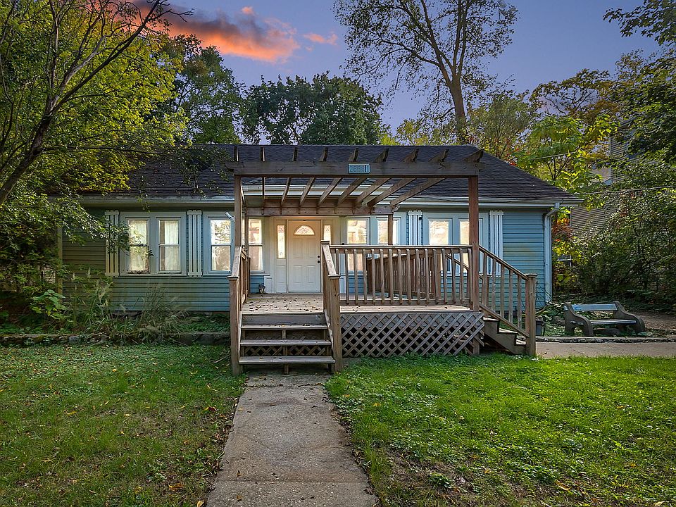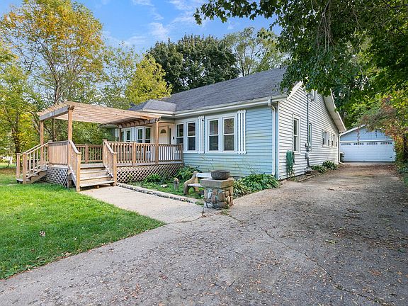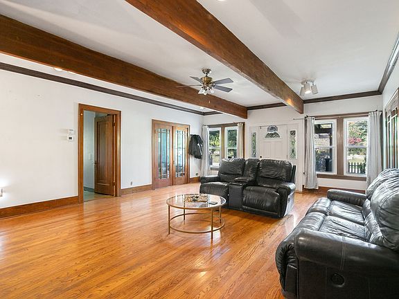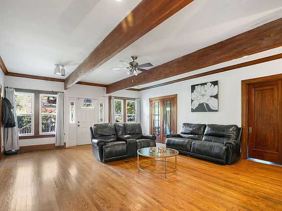 This beautiful bungalow features 4 generously sized bedrooms and 3 full bathrooms. Most rooms feature 10-foot ceilings, rich hardwood flooring, and elegant 6-inch trim. The central living room invites cozy evenings with its charming brick wood-burning fireplace, exposed wood beams, and matching hardwood floors. Love to cook? The sun-filled kitchen offers plenty of natural light-perfect for creating and entertaining. There's 3 bedrooms plus an office and 2 full bathrooms on the first floor and upstairs, there's a loft, 5th bedroom and bathroom. Step outside to relax on the welcoming front deck, or host gatherings on the spacious rear patio, crafted with flagstone and concrete, and enclosed by a privacy fence. Additional highlights include a 2+ car garage and.4 acres- all just down the street from the serene lakefront! Sold As-Is.