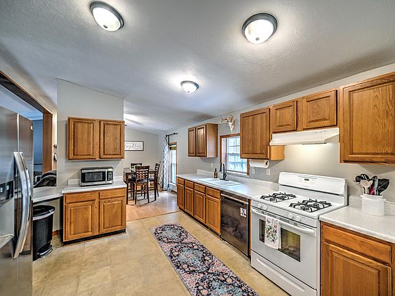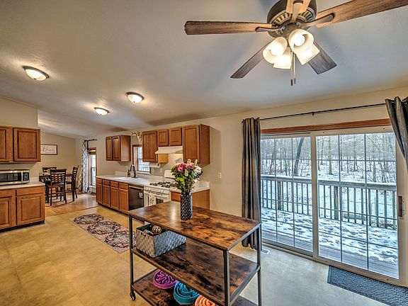 The large kitchen boasts an open pantry and a convenient passthrough window to the living room. Designed for practical living, the primary bedroom is situated at one end, while the other two bedrooms occupy the opposite end. The dining area connects to the living room, creating an open atmosphere. This home also offers a full, unfinished, walkout basement and a breezeway linking the house to the oversized 2-car garage. Enjoy outdoor living on the back deck, surrounded by the tranquility of nature. Updates include a furnace and AC replaced in 2023, roof replacement in 2015 and includes a water softener and pellet stove.