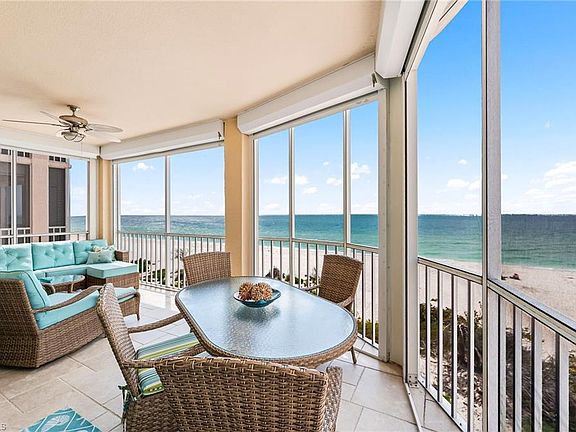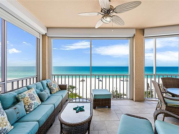 BEST VIEWS AND VALUE in Barefoot Beach Club. Every day is a beach day and every sunset unique in this DIRECT BEACHFRONT condo with panoramic Gulf views all the way to Sanibel Island. Experience luxury beachfront living: listen to the surf, collect shells, swim, relax and enjoy spectacular sunsets on more than 3 miles of white sand beach outside your door. Light fills this open plan, 3 bedroom, 3 full bath END UNIT, much more spacious than a 3 bedroom, 2 bath unit. There’s plenty of room to host family and friends in the expansive great room/dining area and beachside balcony. Kitchen features a large center island, high-end appliances, and breakfast room with unobstructed back-bay view to enjoy the morning sunshine. Walk out to the wrap-around screened balcony from the master suite and great room. Unique glassed-in section of balcony adds interior square footage and can be used as a Gulf-view office. Tile flooring, plantation shutters, custom lighting throughout, furnishings included. Includes ground level storage closet only available with end units. Upscale Barefoot Beach Club offers the most natural, uncrowded beach and relaxed lifestyle in prestigious North Naples/Collier County. Ownership includes a beachside pool and spa, fitness center, and manned gated entry. Minutes to upscale shopping and dining at Mercato, Waterside Shops, Coconut Point, cultural events/concerts, and downtown Naples. Exclusive, secluded location: there's no through traffic, far away from the congestion of other Collier County areas. Easy access to RSW International Airport. Take a drive down the brick paver boulevard and you'll see that nothing else compares at this price!