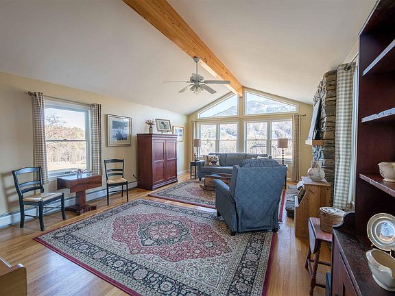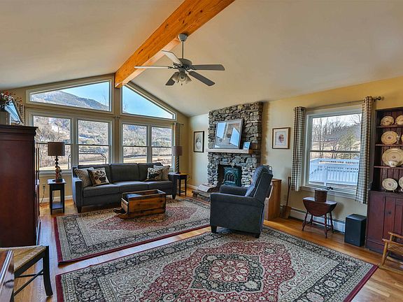 This home with 5 en-suite bedrooms has been tastefully renovated by the current owners. Large comfortable eat-in kitchen with propane range, granite counters & attached pantry. 4 season sunroom. Living room & den both with fireplaces. Apartment with separate kitchen. Lovely hillside setting overlooks the Village of Brownsville to Ascutney Mountain. 7.5 open acres with a deck and fire pit to enjoy the dramatic mountain view. Fenced area. Attached garage & separate 2 bay garage with auto open doors, also a garden shed.Turn key & EZ to show but prefer 24 hr notice. Avoid mud season woes with paved driveway to paved road! Please come see this fine property, you will love it.