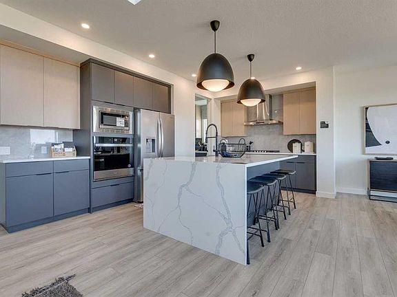 Welcome to The Amber – where luxury meets functionality in every detail. Built by a trusted builder with over 70 years of experience, this home showcases on-trend, designer-curated interior selections tailored for a home that feels personalized to you. Energy efficient and smart home features. This stunning home features a main floor bedroom and full bathroom, perfect for guests or extended family. The executive kitchen boasts built-in stainless steel appliances, gas cooktop, chimney hoodfan, and a showstopping waterfall island with pendant lighting. A separate spice kitchen offers a gas range, a french door, and ample pantry shelving. Soaring open-to-above ceilings in the great room highlight the floor-to-ceiling tiled electric fireplace and flood the space with natural light. Upstairs, retreat to the 5-piece ensuite with a soaker tub, tiled shower, and dual vanities with generous drawer space. With tile in upper bathrooms, LVP on the main floor, and windows throughout, The Amber blends elegance and comfort effortlessly. This energy-efficient home is Built Green certified and includes triple-pane windows, a high-efficiency furnace, and a solar chase for a solar-ready setup. With blower door testing, plus an electric car charger rough-in, it’s designed for sustainable, future-forward living. Featuring smart home technology, this home includes a programmable thermostat, ring camera doorbell, smart front door lock, smart and motion-activated switches—all seamlessly controlled via an Amazon Alexa touchscreen hub. Photos are representative.