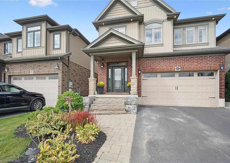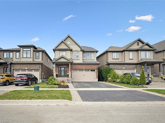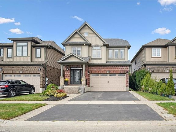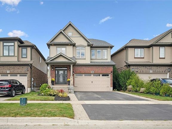 Welcome to Highland Ridge in West Galt! This 3-bedroom, 3-bathroom home offers over 2,279 sq. ft. of living space on a 36 x 105 ft. lot, combining comfort and style inside and out. The redesigned front exterior features a custom front door with upgraded inserts, tumbled stone columns, armour stone steps leading to the covered porch, and perennial gardens framed by interlock french curbs. Step inside to find 9 ft. ceilings, crown molding, pot lighting, and a mix of hardwood and oversized ceramic flooring. The upgraded dark maple kitchen is a standout with extended cabinetry, a walk-in pantry with french door, sit-up island and stainless-steel range hood. The open living and dining area is anchored by a stone accent wall and oversized sliders leading to the fully fenced backyard. Outside, enjoy a low-maintenance space with interlock patio, hot tub, wrought iron gates, and a shed with hydro. Upstairs, a spacious family room with bright windows and wrought iron railings offers the perfect gathering spot. The primary suite features a walk-in closet, crown molding, and a private 3-piece ensuite. Two additional bedrooms, a 4-piece bath, laundry, and large linen closet complete the second floor. Located minutes from downtown Galt, schools, parks, trails, shopping, and golf.