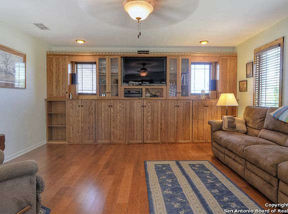 Enjoy your piece of Texas on this 3 acre hill country property with waterfront access in the neighborhood! RV storage on site. Custom built by owner. Energy efficient. Lots of storage & built-ins. Automated landscape watering system. Solid wood doors & wood floors in this open concept plan. Island kitchen boasts an abundance of storage, hard surface counters & track lighting. Master suite offers outside access to patio, tub & oversized shower & closet with built-ins. Horses are allowed. Views from every angle.