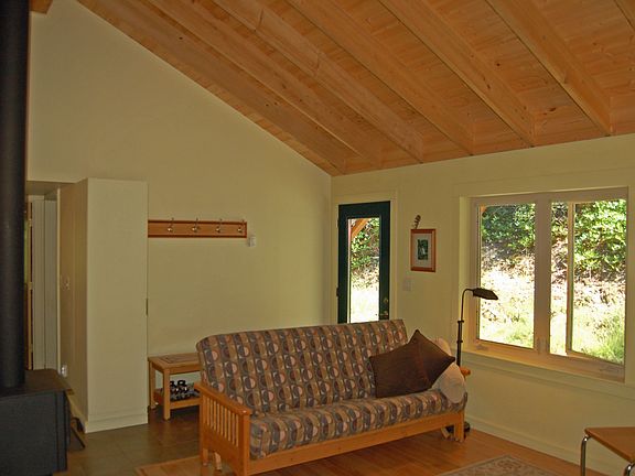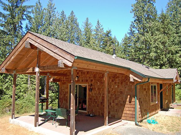 This top quality "small home" featuring oak hardwood floors, porcelain tile and lofted wood ceilings sits in a sunny clearing surrounded by a majestic, towering ring of cedar trees. Besides the home and covered brick patio, the 5.12 acre property includes a shop/studio/bunk house building of equal quality, guest parking and RV hook-up, a fenced garden with lovely custom gate, and a canopy for extra storage. A perfect island retreat or full-time home.