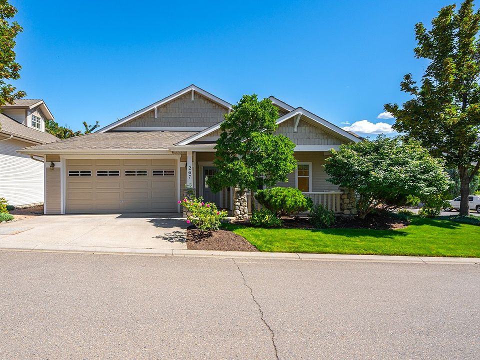 The double attached garage provides parking and storage, with attic access for additional space. The rear patio extends the living area outdoors, with mature landscaping providing privacy and a peaceful setting. The home includes vinyl siding exterior and neutral paint throughout. Landscaping for the low-maintenance, irrigated yard is covered in the monthly association fee.