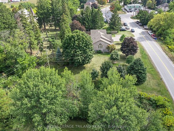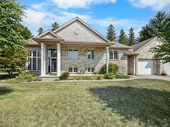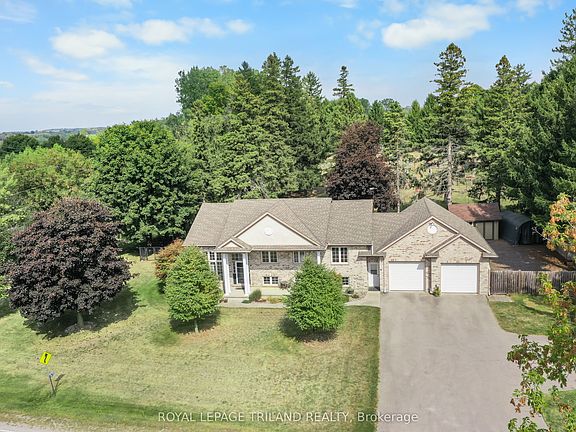 This is the one! Just 10 minutes from London, this stunning acreage with Wallace Creek running through it features a beautiful 4 bedroom raised bungalow with an oversized garage that easily fits two large pickup trucks, plus outdoor parking for an RV, 45ft trailer, and more. Blending modern upgrades, thoughtful design, and expansive living, its amazing inside and out. The home is warm and inviting with vaulted ceilings, open-concept layout, oversized windows, and hickory hardwood floors. A dual sided gas fireplace connects the great room and gourmet kitchen, which boasts a 12 ft quartz island, abundant cabinetry, and casual dining. Patio doors open to a large two tier deck and private yard, ideal for seamless indoor / outdoor living. All bedrooms fit king beds and include closet organizers. The main floor features two bedrooms, including a primary suite with two walk-ins and a spa like bath with double sinks and walk-in shower. Laundry/mud room and powder room complete the floor for easy one level living. The fully finished lower level offers a huge family room, two more bedrooms, full bath with tub/shower/double sinks, and a versatile workshop (pre-wired and plumbed for second kitchen to easily convert for an in-law suite). Direct stairs connect to the oversized insulated garage, perfect for car enthusiasts or hobbyists. Meticulously maintained with a new roof (2016), furnace, AC, and UV air disinfectant system (2017), ultraviolet disinfectant system for water, plus updated doors, custom lighting, and modern finishes. Central vac, gas BBQ line, two sheds, and negotiable zero-turn mower and snowblower add convenience. The sprawling lot offers privacy and mature landscaping, with low maintenance perennial gardens and a peaceful creek that attracts herons, deer, turtles, foxes, and more, your own private retreat. Just 3 minutes to Hwy 401 and under 30 minutes to Ingersoll, Dorchester, St. Thomas, and Aylmer, this exceptional home wont last.