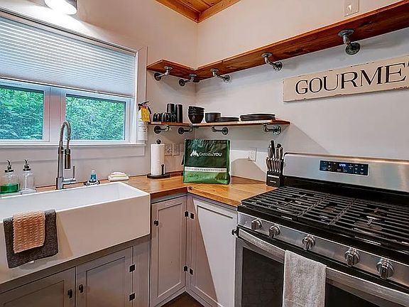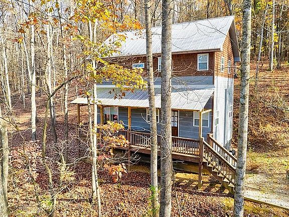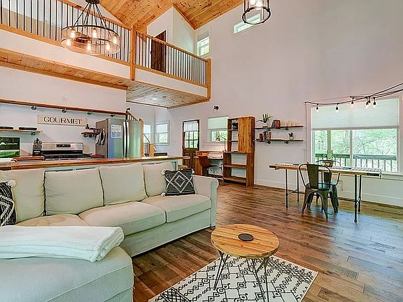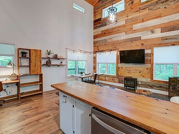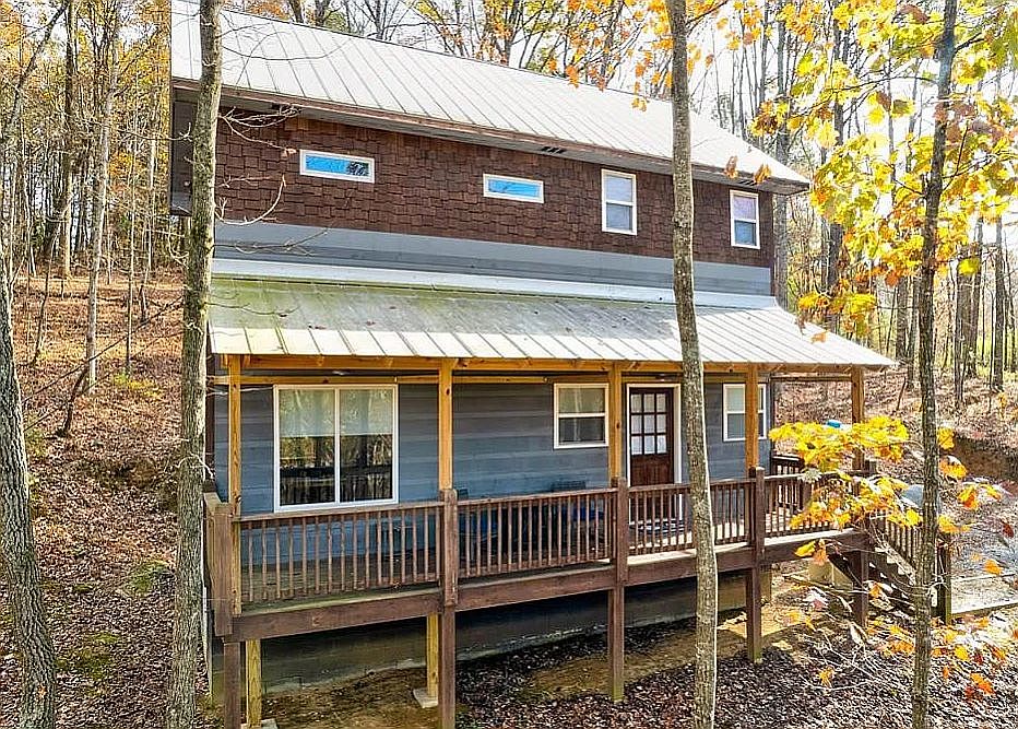 This uniquely constructed residence is perched on 3.47 acres and is ideally situated opposite Engelheim Vineyards. It's merely a 15-minute drive to both downtown Ellijay and Jasper. Revel in the tranquility of the forest and mountain surroundings, with ample space available for an ADDITIONAL building site and already confirmed of approval by Gilmer County! The house was crafted with eco-friendly, non-toxic materials. Highlights include a rustic barn-wood wall, elegant bathroom decor, a lofted bedroom upstairs with a closet, storage beneath the stairs, open wooden shelves, wooden countertops, a bespoke office/workspace, hardwood flooring, and fingerprint-resistant stainless steel appliances. Features also include a farmhouse sink, a deep soaking tub, a laundry washer/dryer, a 12'x16' shed for extra storage, brick bathroom flooring, sliding barn doors, and a tongue-and-groove wooden ceiling. The home is equipped with a whole-house water filter system for the well, abundant windows for natural lighting, and a durable metal roof. The property offers immense privacy and a serene atmosphere throughout the year. Enjoy the outdoors from the deck, watching local wildlife, or gather for a night under the stars. The expansive land offers numerous possibilities for further development and enjoyment. Only 10 minutes from the Doll Mountain Boat Ramp at Carters Lake.