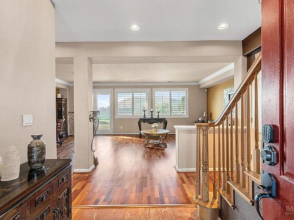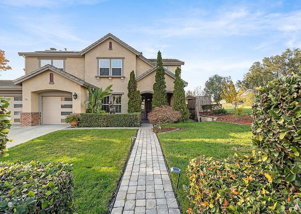 Welcome to resort-style living in the desirable Hiddenbrooke community! Tucked away at the end of a peaceful cul-de-sac, this home overlooks the canyon and offers stunning views of the Arnold Palmer-designed 16th hole and the surrounding natural hillside. This well-designed residence features 3,455 square feet of living space, including three bedrooms plus a versatile multi-purpose room. The kitchen boasts custom cabinetry, stone countertops, plantation shutters, stainless steel appliances, a bar-top counter, and a breakfast area with easy access to the outdoors. A separate formal dining room is highlighted by custom molding, French doors, and plantation shutters. Expansive rear windows fill the spacious living room with natural light and picturesque views. French doors with plantation shutters open to the outdoor patio, while the adjacent family room offers a cozy wood-burning fireplace with a custom mantel and built-in shelving. A full bath and a large laundry room with cabinets and a sink complete the main level. Upstairs, you'll find the generous multi-purpose room with built-in cabinetsideal for a home office or game room. The primary en-suite retreat includes a fireplace, soaking tub, glass-enclosed shower, dual vanities, and dual closets. Step outside onto your private deck to enjoy your morning coffee while taking in views of golfers and local wildlife. Outdoor living is equally inviting with nicely landscaped front and back yards, perfect for relaxing in the spa or grilling for guests. Additional features include a three-car garage with epoxy floors, finished walls, and built-in cabinets, leased solar, a water filtration system, and a tankless water heater. Enjoy Hiddenbrooke's golf course walking trails, The Mat Yoga Studio, J&O's specialty grocery store, and sweeping views of the surrounding hillsthis home truly offers the best of Hiddenbrooke living.