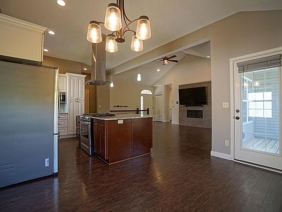 4 bedroom, 3 bathroom, 2758 sq. ft., walkout basement, 3 car attached garage. The covered front porch brings you into the foyer entry that leads you into the living room with cathedral ceilings, custom entertainment center with an electric fireplace and a 75" flat screen TV. The fully appointed kitchen and dining room connect to the living room, all with plenty of natural light. The kitchen features a large island with breakfast bar, granite countertops, upscale appliances, touch sensitive kitchen sink faucet, pantry and plenty of cabinet storage with pull out drawers and soft close doors. Connected to the kitchen you will find the dining room and hallway leading to the laundry/mudroom and the attached 3 car garage. The primary bedroom suite located off the living room features a pan ceiling, 55" flat screen TV, double sink vanity with granite vanity tops, walk-in closet, walk-in tile shower. 2 additional generous sized bedrooms and a full bathroom with a granite vanity top complete the main level. Downstairs is set up for your enjoyment with a large family room featuring a home theater system with projector, 130" screen & surround sound, wet bar, slider door access to the patio and backyard, a large 4th bedroom, full bathroom with granite vanity tops and a storage/utility room complete the lower level. Outside you will find a maintenance free exterior with vinyl siding and front stone accents. The deck and patio allow extra enjoyment of the backyard. This is a well maintained home. Fiber internet is available for this home. (All of the wall mounted flat screen TVs are included with this home. Stated TV sizes are approximate)