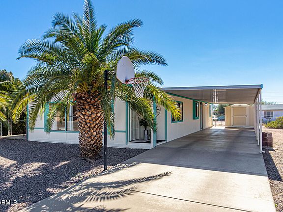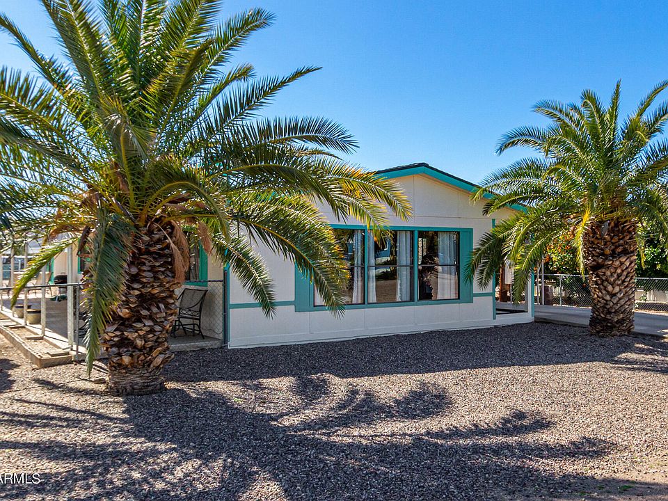 The search is over! This charming home with majestic mountain views is the one you're looking for! Discover an appealing interior showcasing dining & living area w/vaulted ceilings, soft carpet, & bountiful natural light. Gather loved ones in the family room w/ an inviting two-way fireplace. The spotless kitchen includes ample cabinetry, a pantry, matching appliances including a wall oven, & a peninsula w/ a breakfast bar. Relax after a busy day in the primary bedroom, offering an ample closet & a private bath w/dual sinks for added comfort. Close to shopping, restaurants, hiking, tubing, boating, the L202 and US60. This Palm Harbor is ground set on an oversized lot perfect for RV parking, quads or boats. Bring all your toys! No HOA. New roof, carport, Tuff shed, and water heater. Recent upgrades include bathroom plumbing, HVAC, and kitchen appliances. Exterior paint is still under warranty. Enjoy peaceful afternoons in the large backyard showcasing a covered patio, convenient storage shed, & plenty of space for hosting fun get-togethers. You don't want to miss this opportunity!