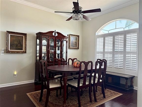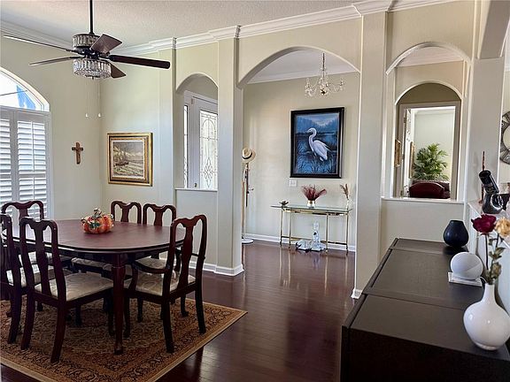Welcome Home to Ocala Palms 55+ golf community! Find sanctuary in one of Ocala Palm’s most sought after fenced-in ½ acre lots. This gorgeous home offers the largest layout of the community; complete with pool and all the upgrades you could desire! This 3-bedroom, 2 bath home features hardwood flooring throughout, estate shutters, crown-molding, ceiling fans in every room and best of all WIFI accessible thermostat. Enjoy your gourmet kitchen that has updated cabinets with pull out drawers, a swing out pantry and quartz countertops. The Over-sized master suite is perfectly built with his and hers designer walk-in closets, a spa inspired bathroom with double vanities, walk-in shower and garden tub. This split floor plan offers two guest rooms complete with a handicap accessible shower in the nearby bathroom (complete with pool access) as well as recessed alcoves in each that are great for extra storage. Walk through the large living room with tray ceiling and enjoy the back yard view of the newly updated lanai (2022). Get ready to entertain family and friends on the lanai with your summer kitchen with upgraded sunshade, brand new waterfall, pool cage with lights and hard-wired Bluetooth accessible outdoor speakers. The pool is salt-water, solar heated and controlled with a Pentair wireless accessible pool-system and don’t forget to relax and unwind in the heated Jacuzzi. This home has Kinetico Mach series water softener that is maintained yearly, a new roof (2023) and lanai screen (2023). The A/C is from 2015 and is serviced yearly. The community hosts an 18-hole golf course, fitness center, indoor pool, arts and crafts studio, card room, multi-purpose room, sewing studio, billiards room, table tennis, and a library that provide plenty of space for recreation, relaxation and activities all just a golf cart ride away. Residents can also stay active outdoors with the outdoor pool, tennis, bocce ball and shuffleboard, and soon to be built pickle ball courts. Don't forget to check out the community's locally owned Bella Cosa Italian Ristorante. This home is perfectly located across from Publix grocery, restaurants, gym and local shopping. Only 3 miles from the World Equestrian Center and minutes to downtown Ocala.