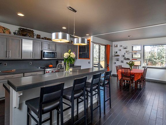 Wake up to panoramic Cascade Mountain views in this contemporary home in Marken Heights. The open floor plan offers clean lines, modern touches, and tall ceilings. Entertain guests in the great room from the well-appointed kitchen, featuring gray granite countertops & newer appliances, including Wolf gas range. Enjoy evening cookouts on the covered deck as your guests lounge in the sauna & hot tub on the patio, or sip your morning coffee while listening to the abundant wildlife. Yard is fully fenced. Back inside, a small bedroom at front of home could serve as home office (Cat-5 cables run throughout the home). Head upstairs to the open loft with space for an additional office/playroom. A sunny owner's suite looks out on the mtn views and features an expansive rooftop deck w/ firepit. 2 more bedrooms & laundry also on this level. 3-car garage offers storage & space for home gym. Home backs to common space and is just steps from Quail Park and a quick bike/walk to Shevlin Park and NWX