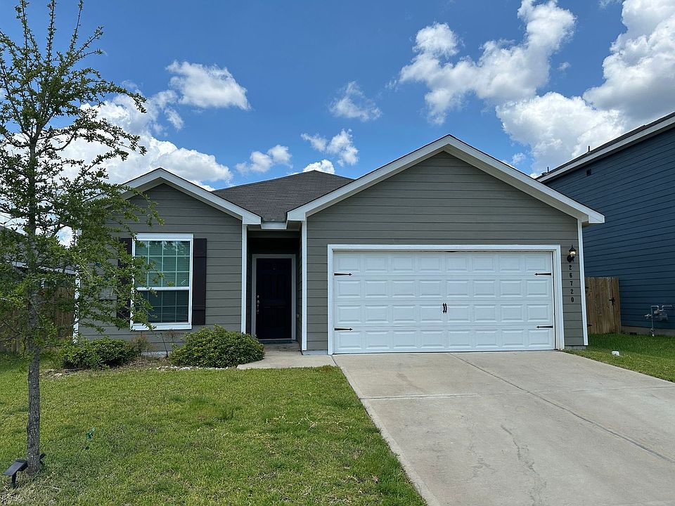 3-bedroom, 2-bath home in Magnolia. The entryway opens to a formal dining room or flex space on the left. The dining area connects to the kitchen, which includes a dishwasher, refrigerator, and microwave. A bar separates the kitchen from the living room, creating an open flow. The primary bedroom is located on the left side of the living room and features an ensuite bathroom with a separate shower, bathtub, and walk-in closet. Two additional bedrooms and a full secondary bathroom are located on the right side of the living room. The home also offers a laundry area, attached garage, and a backyard with patio access from the living room.