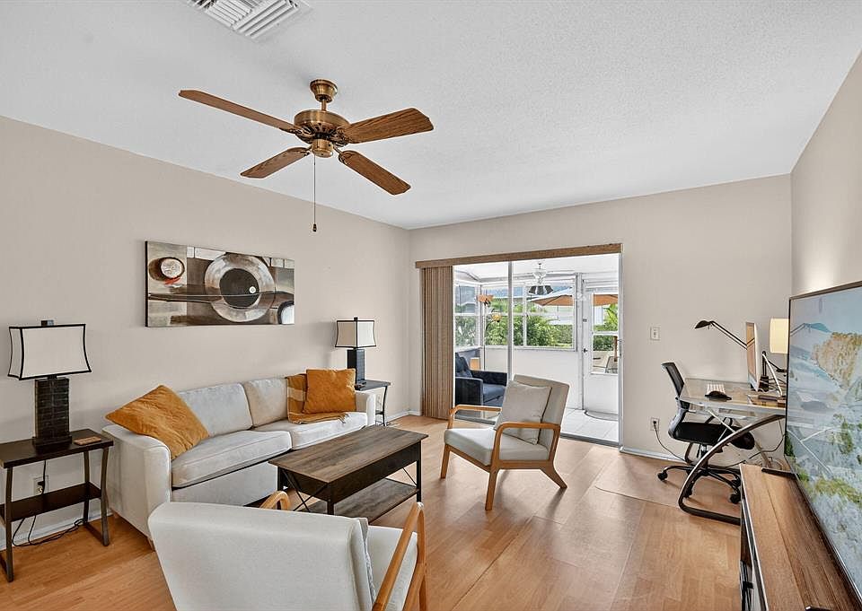 Offered fully furnished or unfurnished! This bright and spacious 1 bedroom 1 bathroom residence is located in a centrally positioned 55+ community just 20 minutes from the beach and under 15 minutes to downtown Lake Worth. The home features a spacious floor plan filled with natural light, freshly painted kitchen cabinets, beautiful hardwood flooring, and a newly updated bathroom.The enclosed patio provides additional living space or a perfect home office. Community laundry is conveniently located just steps away. Residents enjoy access to a clubhouse offering a pool, fitness center, billiards, card room, coffee lounge, library, shuffleboard, and bocce ball courts.
