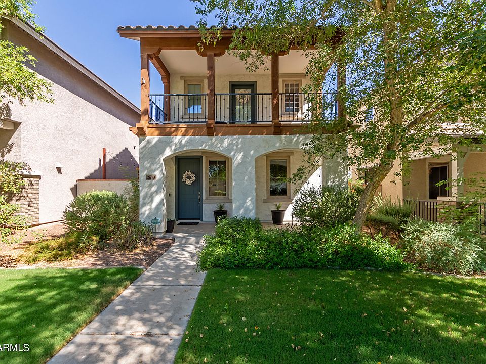Discover this contemporary masterpiece in Verrado! This 3-bed, 2.5-bath home boasts standout upgrades & seamless indoor/outdoor living. Enjoy the open concept layout, granite countertops, SS appliances, stunning backsplash, large sliding door & a glass roll-up garage door in the kitchen. Step out onto your private redwood deck w/ raised garden views. The owner's suite offers dual sinks, double closets & a large balcony w/ breathtaking mountain views. Plenty of room for family or guests w/ 2 more bedrooms, a bath, & spacious upstairs laundry room. 2-car garage has a side roll-up door for easy yard access, this home is a true gem! Welcome to Verrado, w/ tree-lined streets, over 86 unique parks, 21+ miles of walking paths & trails, 2 award-winning golf courses, a fitness center, high performing schools & a diverse array of local restaurants & shops. This community offers 2 community pools, including Heritage Swim Park which is w/in walking distance of the home.