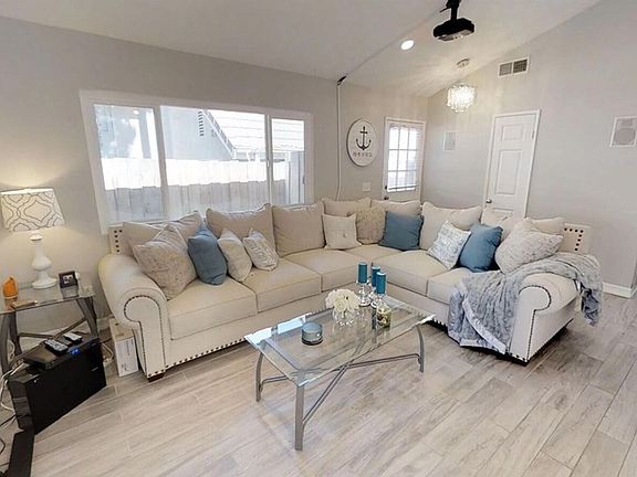 Highly upgraded family home: 3 bedroom, 2 bathrooms, 2 car garage, on a cul de sac. Newer kitchen cabinets, appliances (Frigidaire Signature Series), granite counters and island. Recessed lighting throughout, dual paned windows recently installed, Wood look tile flooring throughout whole house. Both bathrooms updated with custom showers. Custom built closet in Master. Ceiling in Master bath is Blue Tooth speaker. Customized laundry area, scraped and textured ceilings, wainscoting in dining room. Newer light fixtures and ceiling fans. Full copper plumbing; newer AC compressor. Garage has pull-down ladder to attic and newer attic flooring (tons of storage), Beautiful mature landscaping throughout neighborhood. Hot tub 4 pools/spas, 4 tennis courts, basketball court, child's playground, 24 hour security.