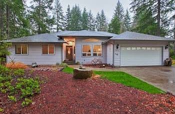 This is a fantastic custom built home in a great secluded area on a huge lot. Extra large front living room with vaulted ceilings and a big family room/dining nook/kitchen combo gives this home plenty of living space. Gas fireplace! There are two bedrooms down the hall and a full guest bath on your way to a giant master suite with a private patio. The master has a huge walk in closet and an additional closet with shelving, sliders to the backyard, and a bathroom with a soaking tub and double sinks. The kitchen features all new appliances including stainless steel fridge, dishwasher, microwave, and range with an island and an extra large pantry. The laundry is off the garage next to the kitchen and has a washing sink and w/d hookups along with more cabinet storage. The garage is also extra big with room for two large vehicles and includes an automatic door opener. The backyard has a covered patio and small pond (and non-working water-feature) The house is on septic and shares a well so utilities will be low. House is on almost an acre and is an entirely useable space and includes a storage shed. Approx 1914 square feet. Pets allowed but negotiable, with increase in deposit. NO SMOKING.