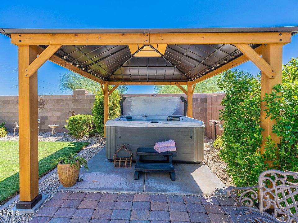 Discover your next favorite place to be. Tour this thoughtfully designed home, relax on the patio, and see how every upgrade adds up to something special with this like new home(2021) with no neighbors behind! Start your mornings on the covered porch, unwind in the spa, or entertain on the extended patio overlooking a landscaped yard. This 3-car garage home shines with a chef's kitchen—quartz counters, 42'' cabinets, gas stove, and huge pantry—plus filtered water & RO. Enjoy upgraded HVAC filtration, ceiling fans in every room, and a spa-like primary retreat with rain shower & soaking tub. Fully insulated for energy savings, with a double gate, raised garden, and rear drip system. Experience it in person, come see what makes the beautifully upgraded home stand out!