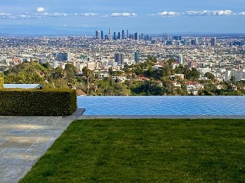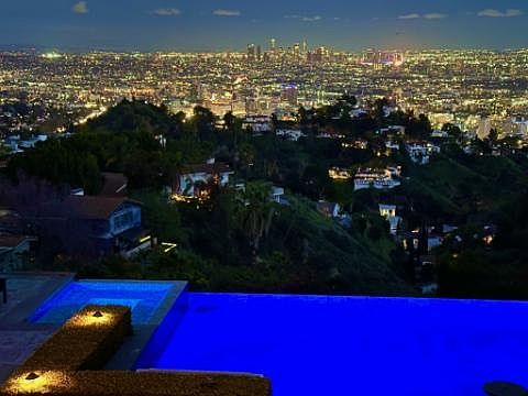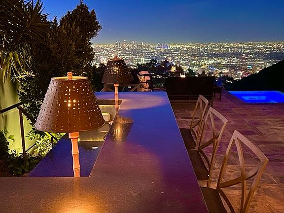 Exquisite Hollywood Hills property showcasing absolutely stunning jetliner, city, and canyon panoramic views. Privately nestled and tucked away at the end of a cul-de-sac in the coveted Outpost Estates, and featuring its own personal/private access to Runyon Canyon, this sprawling 4,000+ sqft home is truly a rare gem. Built in 2009, this custom home was architecturally designed to maximize the captivating views and surrounding beauty, while also maintaining a tremendous amount of privacy. The property incorporates a lovely combination of contemporary and traditional design. Upon entry into the grand foyer, one is captivated by the abundance of natural light, soaring 25' ceilings, beautiful rich walnut hardwood floors, and the highest level of design, detail, and quality craftsmanship throughout. The main level features a gourmet kitchen with a wealth of beautiful custom cabinetry, gorgeous molding, top-of-the-line appliances, a massive island, a luxury wet bar (w/ ice machine & wine fridge), a separate coffee bar, an oversized pantry, and a social breakfast room with a fireplace. The beautiful living room containing well designed built-ins, lovely lighting features, and a handsome fireplace. It also double as a cinema-quality theater with a drop down 110" movie screen and an incredible Dolby surround sound system. A separate formal dining room along with a convenient powder room completes the first floor. A light and bright mezzanine accommodates 4 oversized upstairs en suite bedrooms, all of which showcase garden, mountain, city, or skyline views. The primary suite is a true retreat, complete with a spa-inspired bathroom (with aromatherapy steam system, heated floors, toilet room w/ bidet, and city views), ample closet space, and a private deck overlooking Los Angeles. Adjoining the suite is an exceptionally-designed office with tremendous ceiling height, custom built-ins, a stately fireplace, and striking views. The kitchen serves as just one of many gateways to expansive outdoor space with double French doors. Designed for entertaining, the lush and beautifully landscaped rear yard features a nearly 2,000 bottle humidity/temperature-controlled wine cellar, a bar, built-in BBQ, fire pit sitting area (with views of the HOLLYWOOD sign), multiple seating areas, a 9-speaker outdoor sound system, and a well-manicured lawn. When not entertaining... peace, serenity, and privacy awaits with a large spa that spills over into a 30,000 gallon infinity edge pool that is perched on the edge of the world with 180 degree views centered on the City of Los Angeles. Lounge and relax on the secluded resort-like grounds, while relishing the endless and unobstructed sunrise to sunset views. Beyond (and below) the awe-inspiring infinity pool/spa, is a lovely terraced garden. Property features 56 solar panels, a separate solar pool system, a water filtration system for the entire interior, and a 2-car attached garage with an abundance of street parking (a rarity for The Hollywood Hills). Landlord will pay for the water, as well as the pool and the gardening weekly services Pets OK: Submit Parking: Attached 2-Car Garage; Abundance of street parking