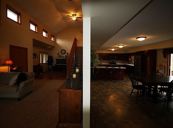 Exceptional Acreage! You will be welcomed by the open spacious floor plan with open balcony to upper level from great room and foyer. Remarkable Gourmet Kitchen with cherry cabinets and deck off the dining area. Second level has large master suite, two additional bedrooms, laundry and large bath with shower and whirlpool tub. Lower level has family room and rec room with bar and space for pool table. Over two acres of yard, fruit trees, and great hill for sledding! Two stall garage and separate workshop area. Beautiful property! Call today to make it yours!