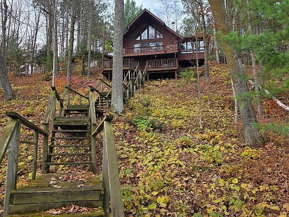 Experience the charm of a chalet-style cabin situated on a pristine sandy lake. This residence boasts breathtaking views of the waterfront, enveloped by mature trees that create a private retreat in the Northwoods. Enjoy cozy evenings by the wood-burning fireplace or bask in the abundant natural light of the four-season room. The home features numerous unique design elements, a walk-out basement, cedar siding, a spacious deck, and a detached two-car garage, making it a truly rare find. Contact us today to schedule a personal tour.