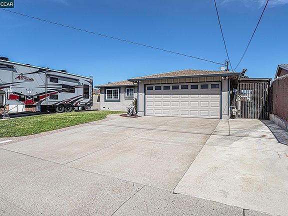 One Level Home with View of the Bay! Great opportunity, to move right into this well-maintained single-story home with owned solar recently installed in 2023. Living room with newer electric fireplace insert and nice size sliding door with a view of the bay. Kitchen has maple cabinets, breakfast bar and solid surface counter tops. Both bathrooms have been updated and back bedrooms have windows that look out to the bay. Other special features include fresh interior paint, central heating, updated ceiling fans and light fixtures, recently replaced sewer lateral in May of 2024, hardwood and laminate flooring and double paned windows. The front and back yards have a lot to offer, including an oversized driveway, a second driveway currently used as RV parking, a cemented side yard with drainage perfect for a dog run area or storage, gazebo and storage shed. The back yard is a nice place to watch the sunset and ships go by on the bay.