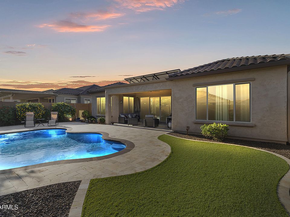 Step into this solar-powered Pursuit model, just over 2,000 sq ft, where comfort meets style. The Tuscan elevation creates timeless curb appeal, while wood-look tile flows through the great room and high-traffic areas, balanced by plush upgraded carpet in the bedrooms. Plantation shutters frame the windows, and a den offers flexibility for work or hobbies. The primary suite features a sleek walk-in shower for modern ease. Outdoors, a block-walled backyard reveals a sparkling pool with a tranquil water feature—your own private retreat. Energy efficiency shines with a fully owned 24-panel solar system and a tankless water heater, keeping utility costs low while you enjoy resort living in Festival.