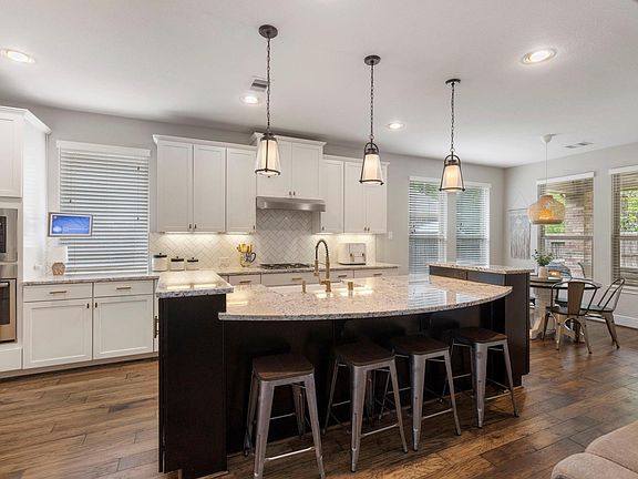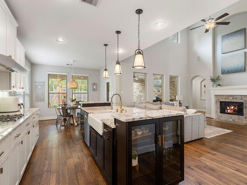 Cozy fireplaceStylish backsplashWall of windowsFormal dining roomCustom drawersPrivate home officeAbundance of storage