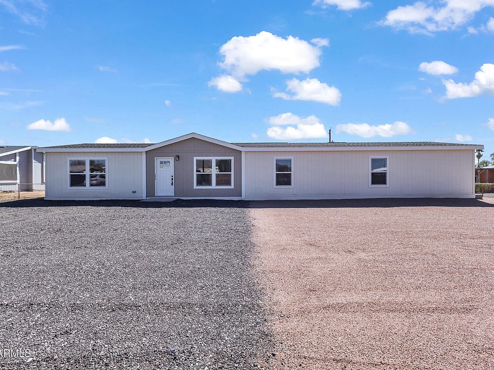 HOME IS INSTALLED AND READY FOR CLOSING! Spacious New Home on a large lot - Move-In Ready! This newly built home sits on a great view lot in a peaceful Apache Junction location, offering plenty of room to create your dream outdoor space. Inside, an open, split-floor plan features soaring ceilings, wood-inspired flooring, and neutral tones for a modern yet cozy feel. The gourmet kitchen is a chef's dream with stainless steel appliances, a massive island with seating. The primary suite features a walk-in closet and a spa-like ensuite with dual sinks and a walk-in shower. No HOA - bring your RVs, toys, and dreams! STOCK PHOTOS OF A SIMILAR HOME SAME BUILDER & FLOORPLAN.
