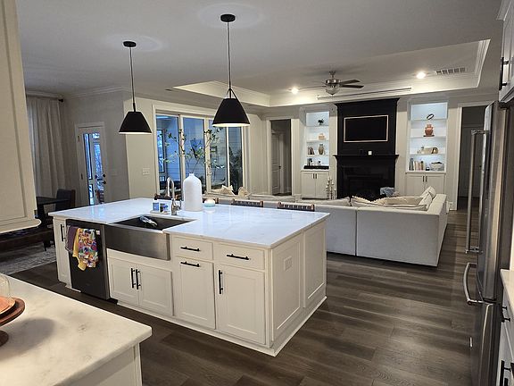 This modern farmhouse retreat offers luxury and comfort with an open floor plan. The gourmet kitchen has top appliances, a walk-in pantry, and a large island seating four. Enjoy a spacious dining area, cozy living room, and huge screened-in patio with a TV, and lounge (hammock will not be available).