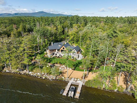 Welcome to the Winnstone Estate, situated on 19+ acres along 366' of southwesterly facing shoreline on Lake Winnipesaukee, comprised of 3 buildings: the Lodge, the Farmhouse, and the Barn. The recently completed, geothermal-powered Lodge, with radiant floors throughout the main level, is designed to handle large groups of family and friends. Boasting floor-to-ceiling windows and doors, accented by timber frame beams around the wood-burning fireplace, the two-story great room will become a favorite place for everyone to gather. Conveniently located next to the commercial-ready kitchen, the dining room makes every meal special, overlooking the water. The primary suite completes this floor with an office, tv room, and indoor & outdoor shower. A private, second-floor guest suite provides further accommodations, while the lower level of the Lodge hosts an additional four guest suites, a family room, and a speakeasy bar. This lower level walks out to a spectacular covered patio featuring an outdoor bar and bathroom. The Farmhouse, completely renovated in 2018, features three bedrooms, two baths, two living rooms, and a bunk loft off the kitchen/dining room. The Barn is approved for a 25kw solar panel roof to run the Lodge and has four overhead doors to accommodate a variety of different sized toys. Imagine more time outdoors, with a three-boat-slip docking system, gorgeous long-lake views, and manicured, stately grounds that light up enchantingly under the endless night sky.
