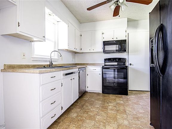 The kitchen is equipped with black appliances, ample cabinetry, and a bright window over the sink. Fresh flooring in the main living areas adds modern style, while the bedrooms offer cozy carpet and ceiling fans for comfort.
