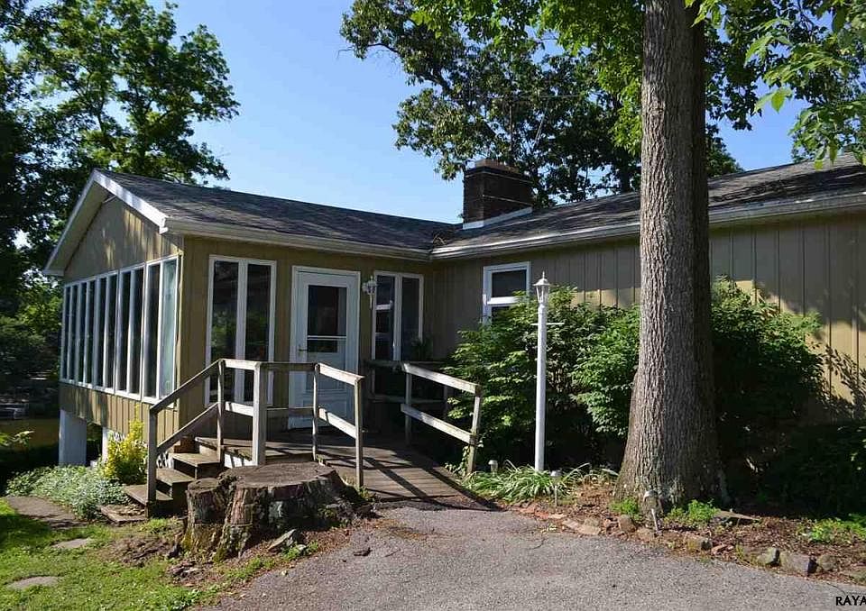 Enjoy the lifestyle of waterfront living with your own boat garage & dock~Second home or year round, this home offers great views of Lake Meade from sunroom and 10 x 29 deck~2 fireplaces~Walk-out basement with full kitchen for entertaining~Patio overlooking Lake~Enjoy swimming, fishing, tennis, playgrounds and pool~All in a gated community with a 300 acre lake.