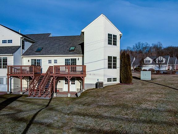 Mint condition END UNIT townhouse in desirable Highfields Golf & CC. Open space layout has fireplaced living room with soaring vaulted ceiling, sliders to deck, oak flooring (recently refinished). Large kitchen w/granite counters and center island w/breakfast bar, recessed lighting, SS appliances, oak floor - adjacent dining area w/wainscoting, oak flooring. Half bath on first floor with laundry. Large master bedroom with two closets - one a walk-in, the other is very deep. Generous sized secondary bedroom. Full bath with ceramic tile, vanity with granite top. Beautiful walk-out basement with 9-lite double doors and double-hung windows for excellent natural light, and the basement is roughed for a future bath. Gas heat, town sewer and water. Minutes to Pike, 495, Train. Grocery store is 2 miles away.