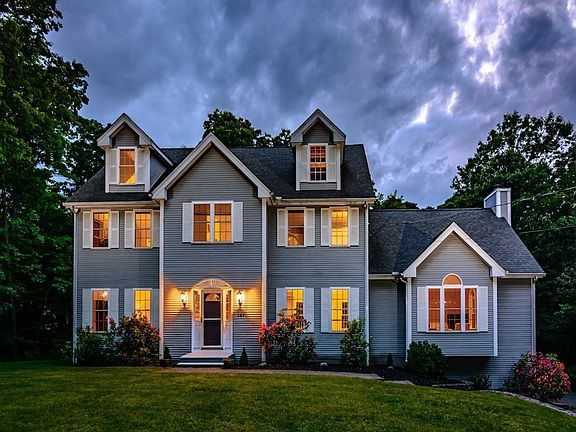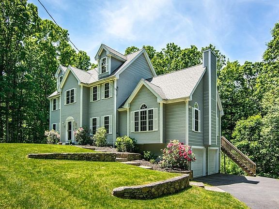 Lovely open concept Colonial situated on a private wooded lot on a tree lined country road. Upon entering this freshly painted home you are greeted with a large Dining Room which flows into a spacious Eat-In Kitchen and then into a oversized Family Room with a fire place. There is also Laundry on the first floor as well as a Full Bath. In the front of the house there is a lovely room currently being used as an Office.The Master Bedroom has a walk in closest and a Full Bath with a jetted tub The windows in the Master have remote controlled blinds and immaculate hardwood floors and vaulted ceilings.The second floor also consists of three charming Bedrooms that share a Bathroom. The partially finished basement has a sound proof room that is currently being used and an office and there is more space available to be finished. This home is close to many are amenities such as shopping, dining and public beaches all with in 5 miles!