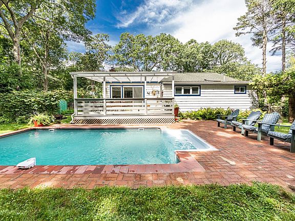 Good things DO come in small packages! This clean and bright ranch style home is deceiving to the eye. There are 5 total bedrooms, 3 of which are ensuite, and 4.5 bathrooms tucked into this tidy package.The main living room features hardwood floors and a wood burning fireplace. The adjacent eat in kitchen opens to a large covered deck that overlooks the back yard and pool area. The main level also features a primary en suite bedroom, and two additional en suite bedrooms plus a hall powder room. The finished lower level has two additional (legal) bedrooms with a shared bath and two additional common rooms with appropriate egress/separate entrance, and completes the approximately 2000 SF of total living space.Tucked behind hedges both the front and rear yards are quite private and the property is bordered not by neighbors, but vacant land and lovely trees making the lot feel substantially larger. Very close proximity to East Hampton Village, Damark's Market, Round Swamp Farm Stand and Ocean beaches. There is a TON of activity on this property - don't wait for your chance to see it!
