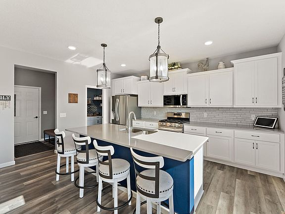 Outstanding 2024-built two-story in the highly-sought after Legacy Bay Farms! Beautifully finished top to bottom with over $95,000 in upgrades to fall in love with this home! Better than new, shows like a model with all the upgrades. From the moment you pull up, you will notice the concrete curbing around the trees & landscaping. Permanent lights surround the front roofline of the home, ready for year-round fun. No more ladders to hang your holiday lights! The lovely front porch leads you into the spacious entry & flex room. Perfect for your home office, piano or library. You will appreciate the large open floor plan! The living room has a gorgeous stone fireplace & mantle, recessed lights plus wide plank flooring across the entire floor. Large picture windows bright up the living room, w/motorized blinds. Your large table will fit comfortably in the dining room w/more options to sit at the breakfast bar. Fantastic kitchen has the large quartz island w/sink, ready for all your food prep. Tiled backsplash, new kitchen lights & newly finished walk-in pantry w/additional counter & storage space! Mudroom has hooks for coats & room for your bench w/half-bath nearby. Upper level has four bedrooms & separate laundry room w/window. New Samsung washer & dryer added plus cabinets & shelf. The landing has a new chandelier & motorized shade for the large window. Lovely tray ceiling & new fan/light in the primary bedroom w/large picture window, new blinds & walk-in closet plus private ¾ bath. Dual sinks, new towel bars, new mirrors, & shower door added. Most bedrooms have walk-in closets, new ceiling fans/lights & fresh paint. Full bath near the bedrooms. Lower level family room has space for large furniture & game area plus the fifth bedroom w/large walk-in closet. Fourth bathroom is nearby. Utility room has room for storage, new Honeywell humidifier added & water softener installed. Step outside to the incredible fenced backyard, ready for all your gatherings. All new! Built-in grill w/electric rotisserie, professionally designed & installed patio brick w/firepit plus light feature & built-in bench, lovely pergola w/covers & new shed nearby! Neatly manicured yard, retractable water hose reels. Garage is newly finished w/new heater added. Don't miss it! Welcome home!