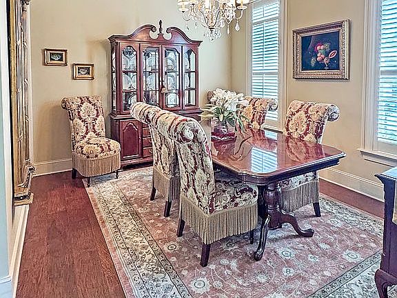 Inside, you’ll find an inviting living space with rich hardwood floors, soaring ceilings, and a cozy gas fireplace. At the heart of the home is a gourmet kitchen featuring an oversized island, double ovens, and stainless steel appliances. Just off the kitchen, a wet bar leads into the formal dining room, providing an elegant space for hosting gatherings and holiday meals.