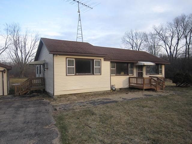 Waterfrontage! 2 bedroom ranch on a channel in Center Lake Woods and on a large 1 acre lot. The 2-car detached garage has double entry. There is a voluntary HOA with lakefront park and clubhouse. Center Lake is 129 acres and ideal for boating, swimming and fishing.