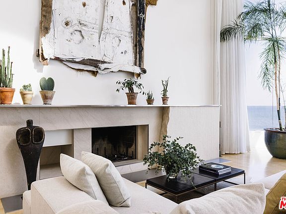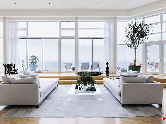 A visionary architectural statement along the sands of Malibu Cove Colony, this sculptural beachfront residence exemplifies the harmony between form, light, and the Pacific horizon. Conceived as both a work of art and a livable sanctuary, the home is enveloped in walls of glass and sweeping organic curves, where each line is drawn toward the sea. With 60 feet of ocean frontage, multiple terraces, and panoramic vistas stretching from Point Dume to Palos Verdes, every room becomes a front row seat to nature's performance. Inside, soaring ceilings and skylights pour daylight across fluid, gallery like interiors that blend contemporary sophistication with a serene coastal palette. The main living area unfolds seamlessly with living, dining, and kitchen spaces unified by transparency and light. A sleek fireplace anchors the space, while the kitchen's stainless steel appliances, bar seating, and built in banquette evoke both utility and style. Step through glass doors to the full width oceanfront balcony, a stage for golden sunsets and intimate al fresco dinners. Above, a tranquil loft office and sitting area opens to an expansive deck, with exterior stairs ascending to a private rooftop retreat, perfect for sunbathing or quiet reflection. Below, three serene bedrooms, each with ensuite baths, offer restful privacy. The primary suite, a masterful composition of texture and tone, features a sitting area with fireplace, a spa inspired marble and limestone bath with a soaking tub poised before the sea, and a private terrace that frames the coastline in cinematic splendor. Set at the end of a prestigious guard gated enclave, this Malibu Cove Colony residence is more than a home; it is a modern sculpture in glass and light, celebrating the seamless dialogue between architecture and ocean.