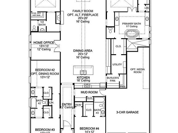 Welcoming entry with 12-foot ceilings flows to the family room, dining area and kitchen. Open family room with a wood mantel fireplace and wall of windows. Island kitchen with built-in seating space, double wall oven, a 5-burner gas cooktop, butler's pantry and corner walk-in pantry. Home office with French doors just off the open floor dining area. Private primary suite offers 13-foot coffered ceiling, double door entry to bathroom, dual vanities, freestanding tub, spacious glass enclosed shower, and a walk-in closet with private access to the utility room. Half bathroom just off the game room with 13-foot coffered ceiling near rear of home with additional storage area. Guest suite with full bathroom and walk-in closet. Additional bedrooms with walk-in closets and a Hollywood bathroom complete this generous design. Covered backyard patio. Mud room with closet just off the three-car garage.