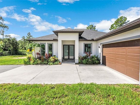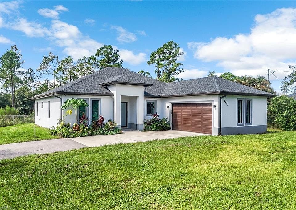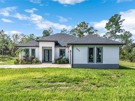 Welcome to this beautifully crafted 2022 single-family home in Golden Gate Estates! The home features 3 bedrooms plus a den, 2 bathrooms, and nearly 2000 sq. ft. of living space. Nestled on 2.73 acres, this property provides endless possibilities - build a pool, a barn, or stalls and bring your horses and other animals. Inside you'll find an open-concept design with 24x24 porcelain tile throughout, a spacious formal living and dining area, and a modern kitchen featuring quartz countertops, black stainless steel appliances, pantry, and in-home laundry. The split-bedroom floor plan ensures privacy, while the den offers flexibility for an office or guest space. Enjoy peace of mind with impact-resistant windows and doors, a whole-house reverse osmosis system, and a screened lanai overlooking a private wooded backyard. The 2 car garage adds convenience, and the fenced-in yard provides added comfort and security. Located just two streets from the shopping plaza at Golden Gate Blvd. and Everglades Blvd., this home combines modern living with space and tranquility.