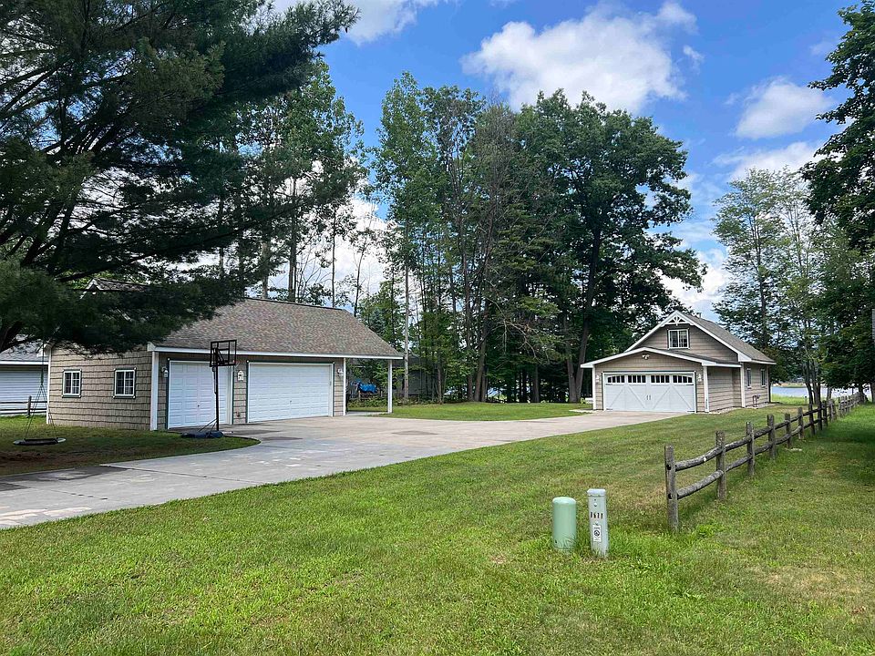 PLEASE CLICK ON THE VIDEO TOUR! Enjoy the view of main Secord Lake from this 3 bedroom 2 bath Chalet with an attached garage and additional 3+ 32 X 24 detached garage with a covered patio, Attractive shake shingle vinyl siding. Near the end of a dead end street, with minimal traffic. Nice waterfront firepit for those cozy evenings. The beach area has underlayment to protect the beach until the water comes back.