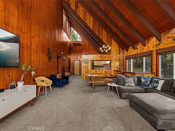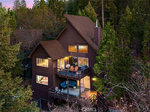 ICONIC ... this lakeview modified A-frame exemplifies modern architecture and aesthetics - while simultaneously capturing the essence of mountain living! Situated on a cul-de-sac with level entry, a 2 car attached garage, golf course adjacent and boasting a 1/3 acre lot of pristine forest ~ this home is being sold fully furnished! While the exterior of the home presents expressive lines & dramatic effect ... the interior is truly inspiring. Expansive ceilings seem to soar forever allowing for the multitude of windows to cast their spells of wonder - as you watch the nature around you unfold and the skies morph into remarkable works of art. A modern open concept design dominates the main level and is highlighted by an updated kitchen with newer appliances, newer dual pane windows and a towering fireplace. A custom wooden plank dining table is a perfect complement to the contemporary elements that punctuate this home. A total of 3 bedrooms and a hall bathroom complete this floor - with each of the secondary bedrooms featuring the cathedral ceilings present in the main living areas. The primary suite is stunning - with expansive ceilings, exposed wooden trusses and views of the golf course and lake. The primary suite also features access to the upper deck ... where you'll find uncompromising views and open skies. As you descend to the lower level, you'll notice a transformation from warmer/richer wood tones to a brighter lighter space that's been designed for the perfect entertaining area. Able to accommodate a large game or family room - this design can also be applied to host multiple families or guests, while allowing them to still enjoy an elevated mountain experience - including another deck that's even larger that its upper counterpart and provides access to the fenced in backyard and another patio space. This level features 2 bedrooms and a full bathroom with tons of additional storage and potential expansion/design possibilities. Thinking of designing separate living quarters with its own entrance - this would be your perfect canvas! An exquisite Lake Arrowhead property includes LAKE RIGHTS, two ductless air conditioning systems and is less than 10 minutes from Lake Arrowhead Village and even closer to downtown Blue Jay. This highly coveted location also places you just down the street from the Lake Arrowhead Country Club and Grass Valley Lake. This truly eclectic work of art is ready to inspire its next owners ... the wilderness is beckoning!