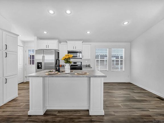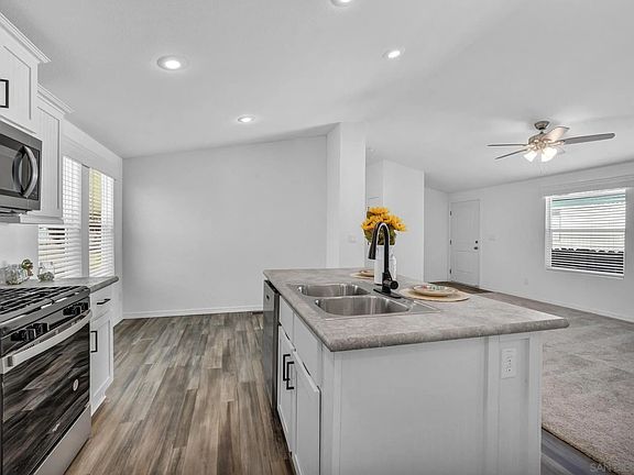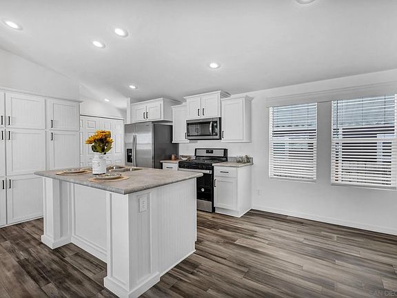 Neutral palette throughout this home. Cabinetry is white beaded wood with black hardware. Neutral countertops and matching backsplash. Upgraded Stainless kitchen package includes side by side refrigerator w/water & ice dispenser, built-in microwave, dishwasher, sink w/pull down sprayer. The kitchen also offers canned lights and an island. Ceiling fan w/light in all bedrooms and living room. Elongated toilets, wood framed vanity mirrors, & tub/shower combo in both bathrooms. Walk-in closet in primary bedroom. Faux wood blinds, 6 panel w/lever door handles, soft close doors & drawers throughout. 40 gallon water heater. This home is 50 amps (as is park). Attached shed. This home is equipped with the California fire pack, which includes wildland fire code vinyl frame windows throughout, exterior doors and siding meet WUI (wildlife urban interface) requirements as well. There is a peaceful babbling brook behind the home, that will put you in a restful feeling when relaxing in the primary bedroom. Home is near pool and clubhouse for convenience! Peaceful, affordable country living.