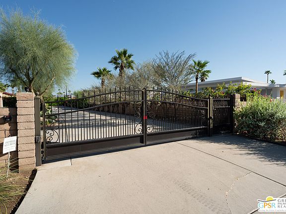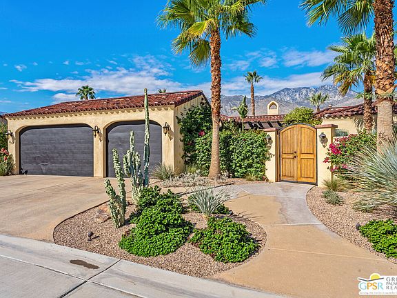 Nestled in the heart of Araby, one of Palm Springs' most coveted neighborhoods, this stunning residence combines the look of traditional Mediterranean and Spanish architecture with all the modern amenities. Sitting on land that you own, and with no HOA fees, this four-bedroom, four-bathroom home offers an exceptional blend of comfort and sophistication. Located on a private street with its own security gate, you drive up to this exceptional home that boasts a direct access 3-car garage with additional driveway parking. As you enter the property through the front gates, you are surrounded by a lushly landscaped courtyard, complete with its own firepit and conversation seating area. The Saltillo tile pathway leads to the rustic alder double entry doors. Through the doors, the view of Mt. San Jacinto takes your breath away. The charm continues with a layout that emphasizes open spaces and abundant natural light. The wood-clad vaulted ceiling with exposed wooden beams and numerous archways add to the property's architectural allure, while the slate flooring provides a rustic touch. Sit down to enjoy an intimate evening with friends in front of the fireplace or use the entire expanse of the great room to entertain a crowd. The gourmet kitchen features a large central island, expansive breakfast bar and modern appliances, but the slate floors seamlessly integrate the rustic charm throughout. A separate family room adjacent to the kitchen offers another space for TV viewing or intimate gatherings. The primary bedroom features a cozy fireplace and stunning mountain views through 2 sets of double doors. The large ensuite bathroom boasts a long double vanity with beautiful copper sinks. You will also find a separate tub and shower and abundant natural light, providing a truly indulgent retreat. There are three additional bedrooms; two with ensuite bathrooms and one with a private entrance and patio. The free form pool and spa on the over-sized lot is complemented by the gazebo and outdoor barbeque area. There is a large, covered patio for al fresco dining and it provides the perfect setting for entertaining or just watching the sunset over the mountaintops. Don't miss your opportunity make this exceptional residence, located on historic Anza Trail, your own!