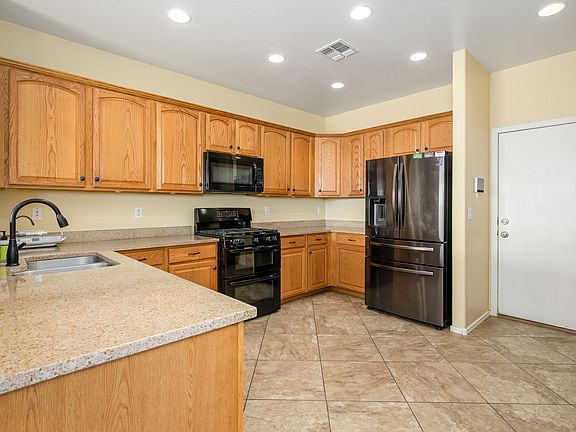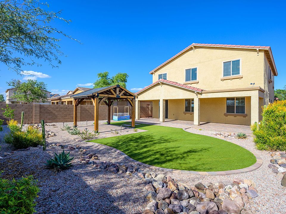 Welcome to this beautiful 5-bed, 3-bath home in a desirable master-planned community. The bright, open layout features high ceilings and plenty of natural light. The kitchen includes stainless appliances and a walk-in pantry. A downstairs bedroom and full bath are perfect for guests or a home office. The spacious primary suite offers dual vanities, a soaking tub, and separate shower. Enjoy a beautifully landscaped backyard with a covered patio that backs to open space ideal for entertaining.
